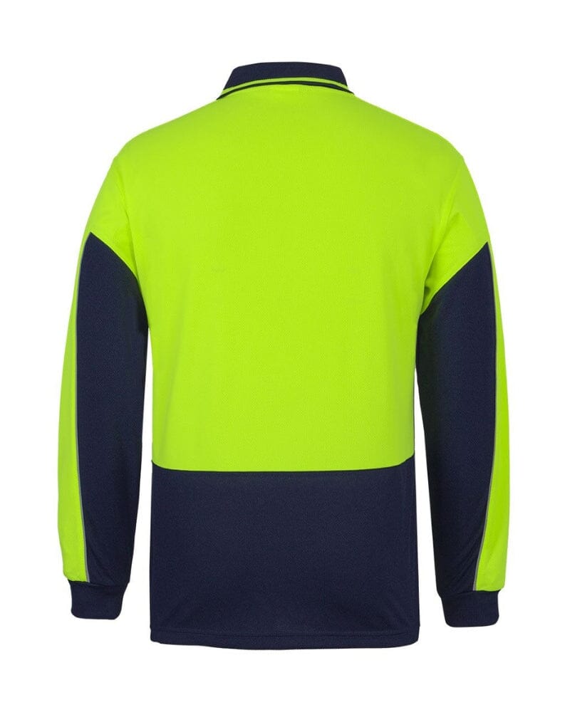 Hi Vis Long Sleeve Gap Polo in Lime/Navy combines safety with comfort. Crafted from 160gsm micro mesh with JB's Dri™ moisture-wicking technology, it keeps you cool and dry on the job. UPF-protected and compliant with Australian safety standards, this durable polyester polo features a reinforced chest pocket and jacquard hi-vis stripe collar for visibility and practicality.