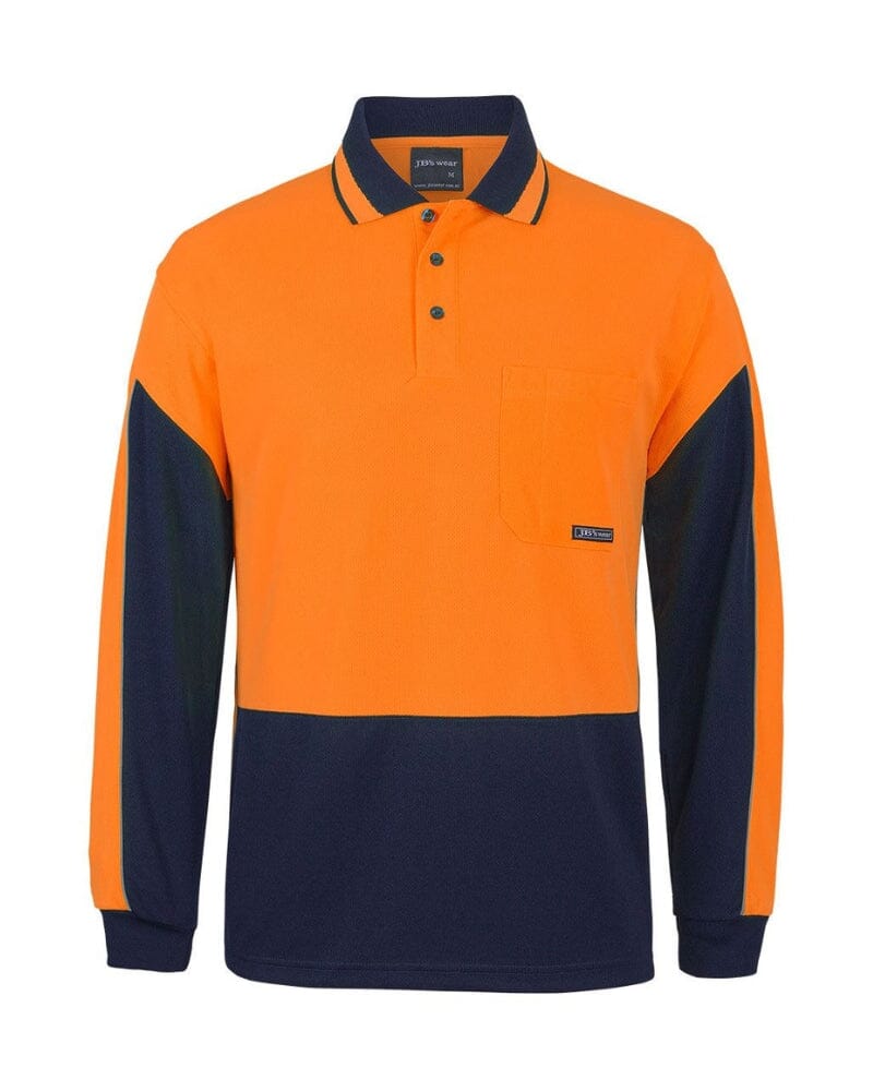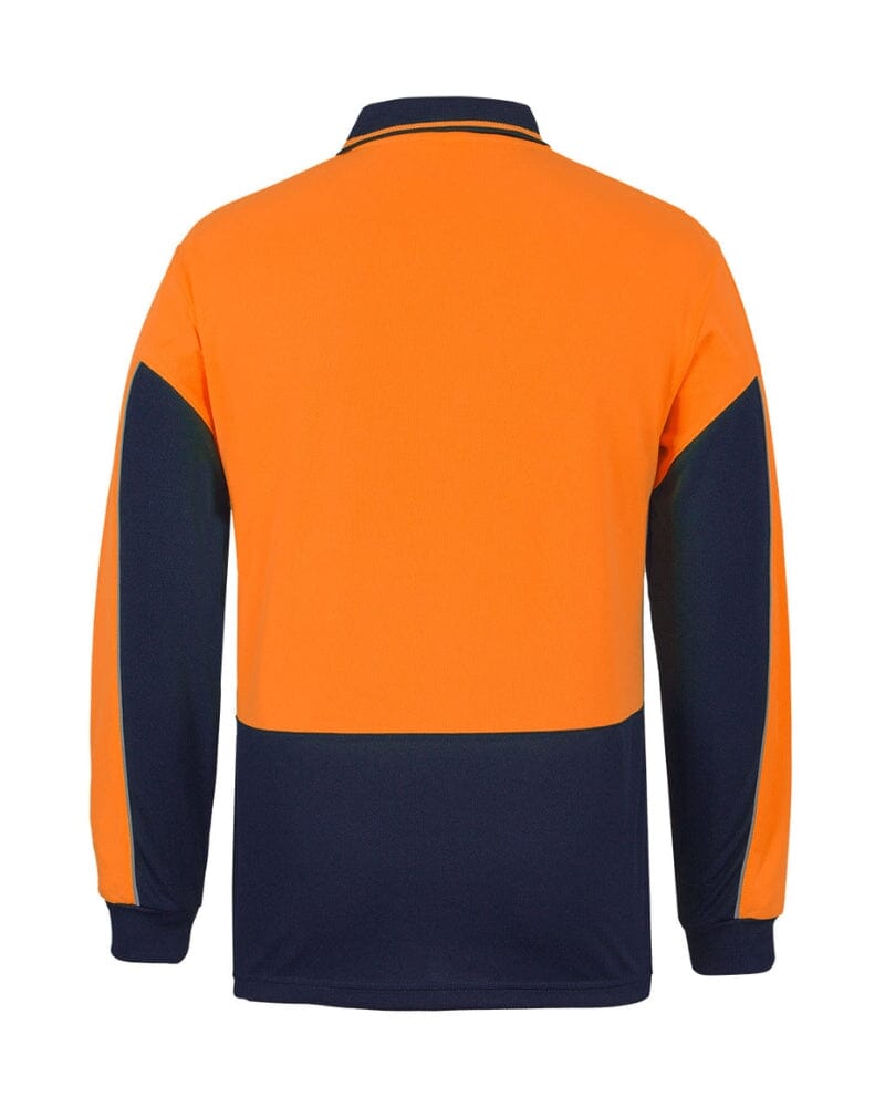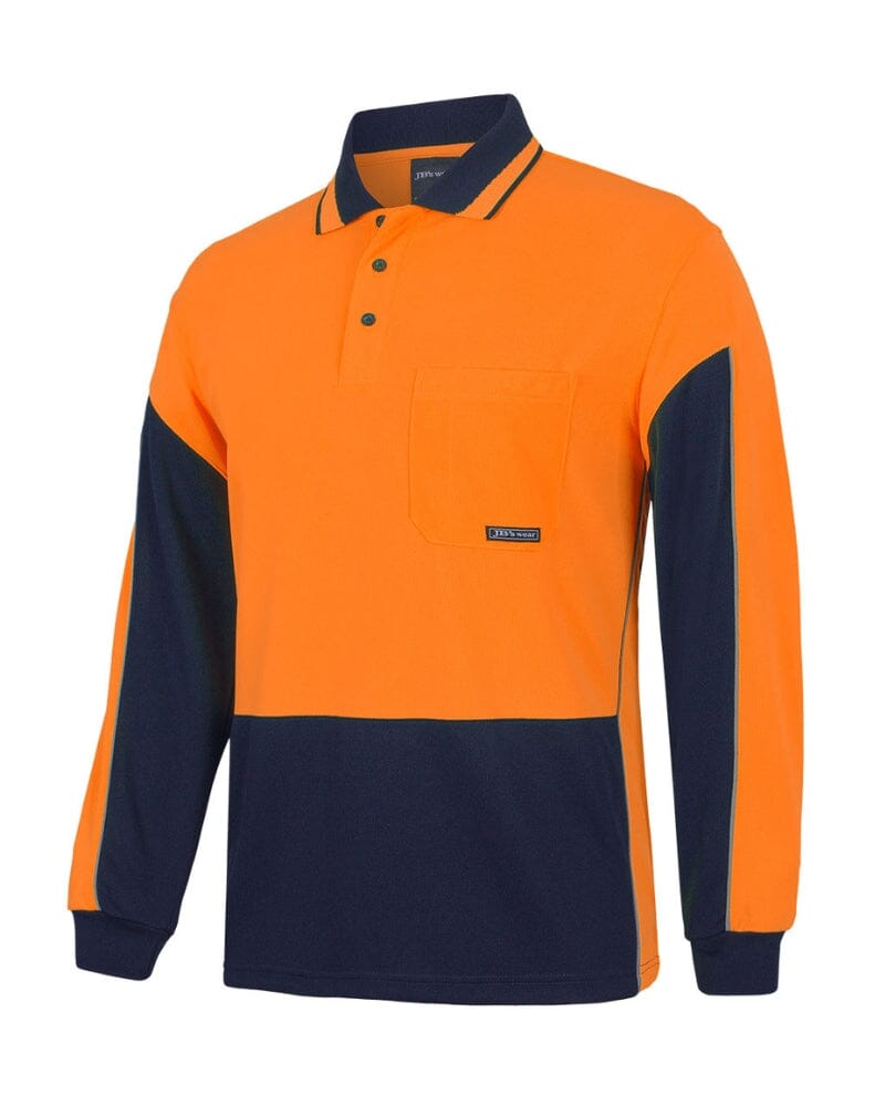Hi Vis Long Sleeve Gap Polo in Orange/Navy combines safety with comfort. Crafted from 160gsm micro mesh with JB's Dri™ moisture-wicking technology, it keeps you cool and dry on the job. UPF-protected and compliant with Australian safety standards, this durable polyester polo features a reinforced chest pocket and jacquard hi-vis stripe collar for visibility and practicality.