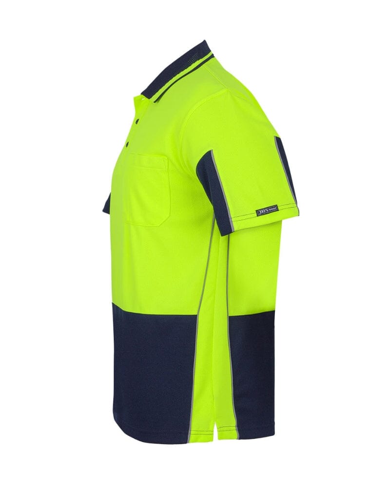 Hi Vis Short Sleeve Gap Polo in Lime/Navy combines safety with comfort. Crafted from 160gsm micro mesh with JB's Dri™ moisture-wicking technology, it keeps you cool and dry on the job. UPF-protected and compliant with Australian safety standards, this durable polyester polo features a reinforced chest pocket and jacquard hi-vis stripe collar for visibility and practicality.